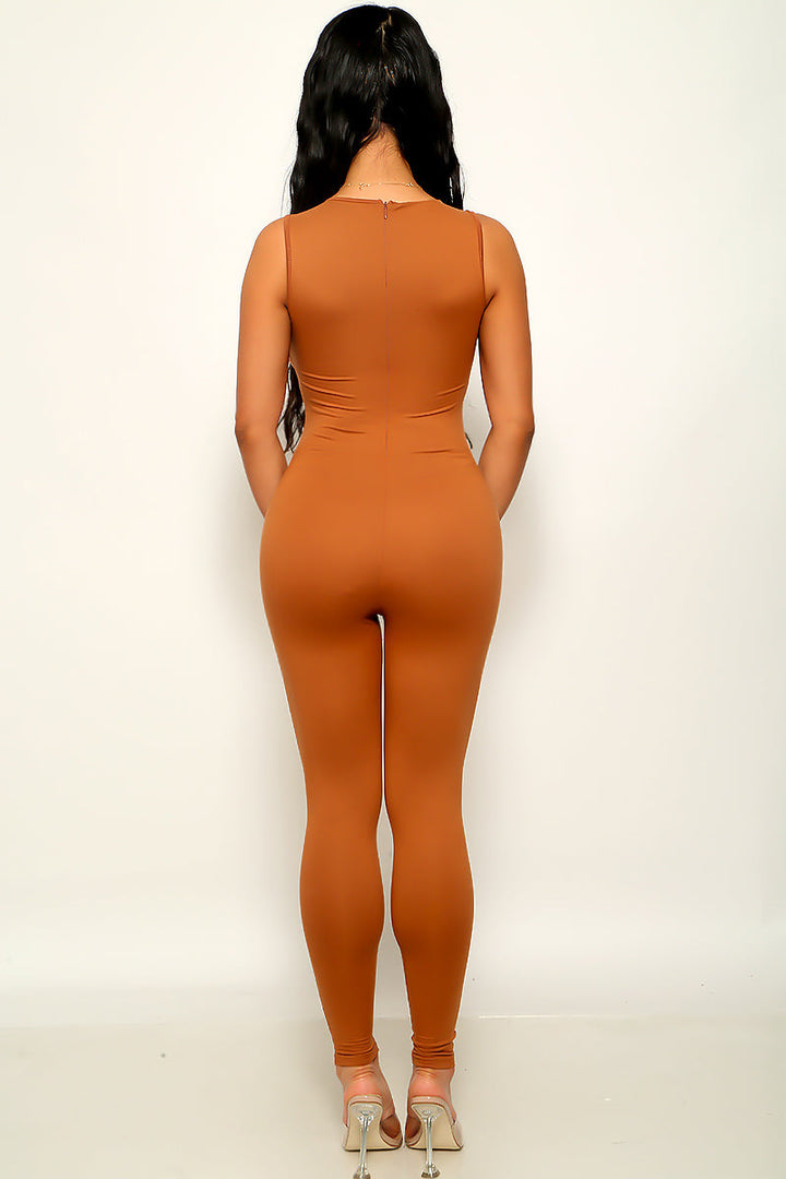 Light Brown Stretchy Faux Suede Sleeveless Sexy Fitted Jumpsuit