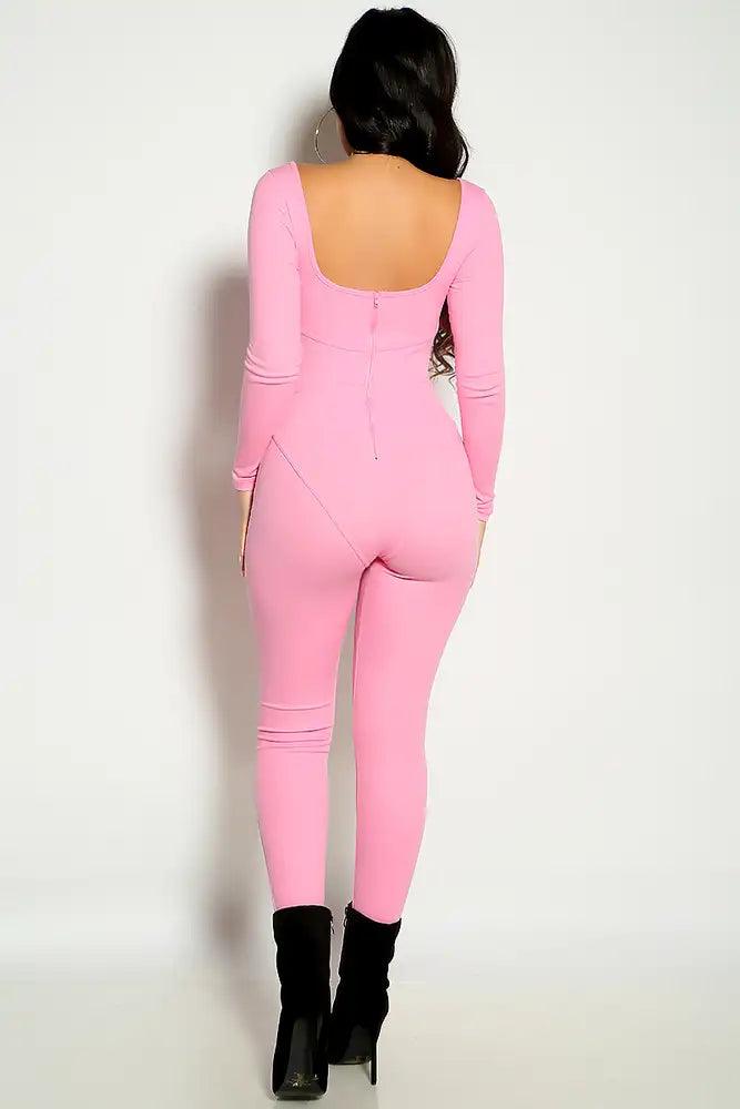 Pink Long Sleeve Ribbed Zip Up Corset Piping Fitted Jumpsuit