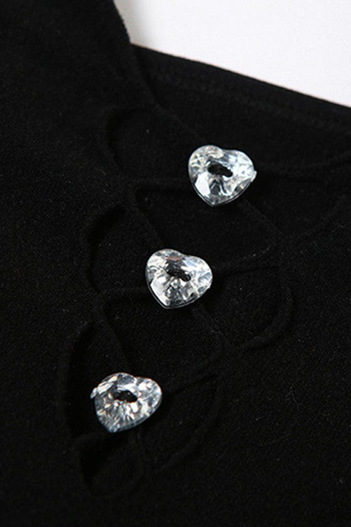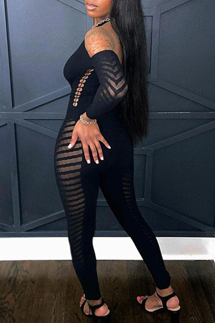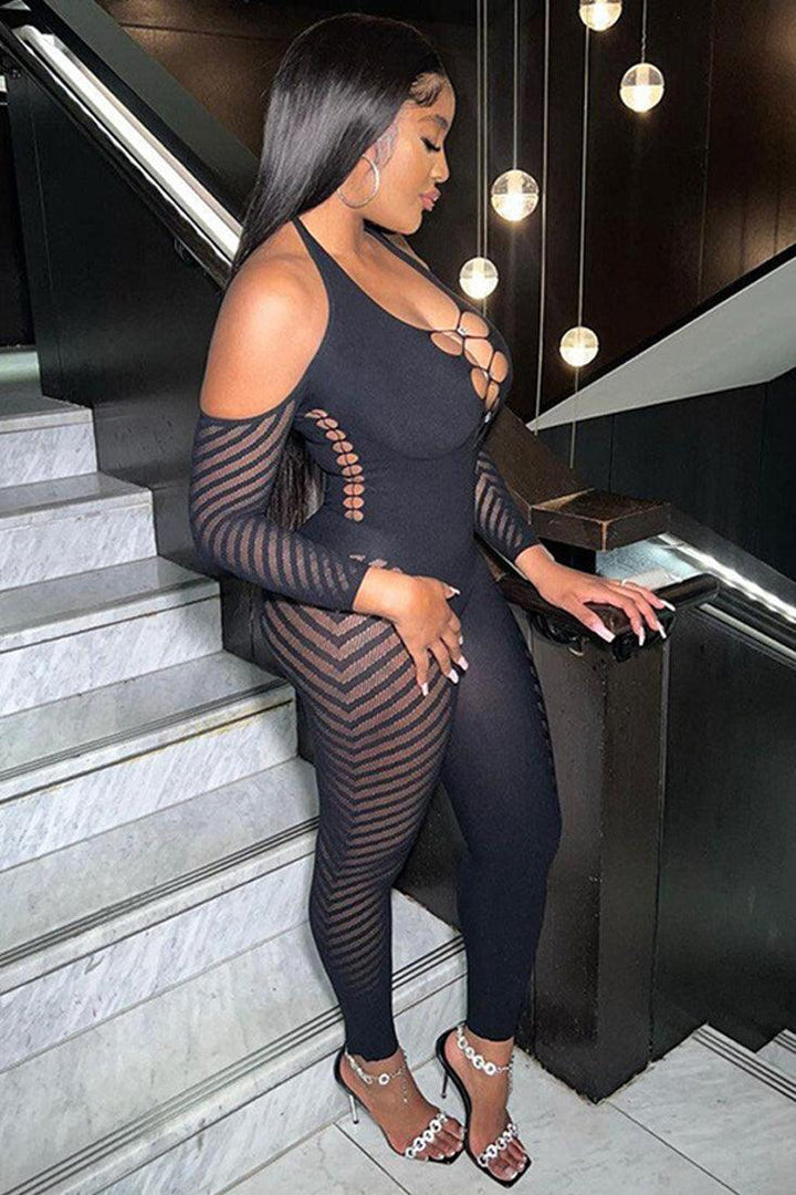 Black Halter Netted Cut Out Heart Rhinestone Jumpsuit Catsuit