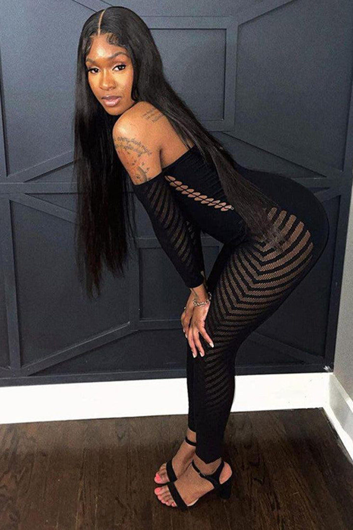 Look like a diva in this stunning Black Halter Netted Cut Out Heart Rhinestone Jumpsuit Catsuit. Its cut out heart motif and rhinestone detail adds a touch of glamour that will make you look like an absolute star. Get ready to shine!