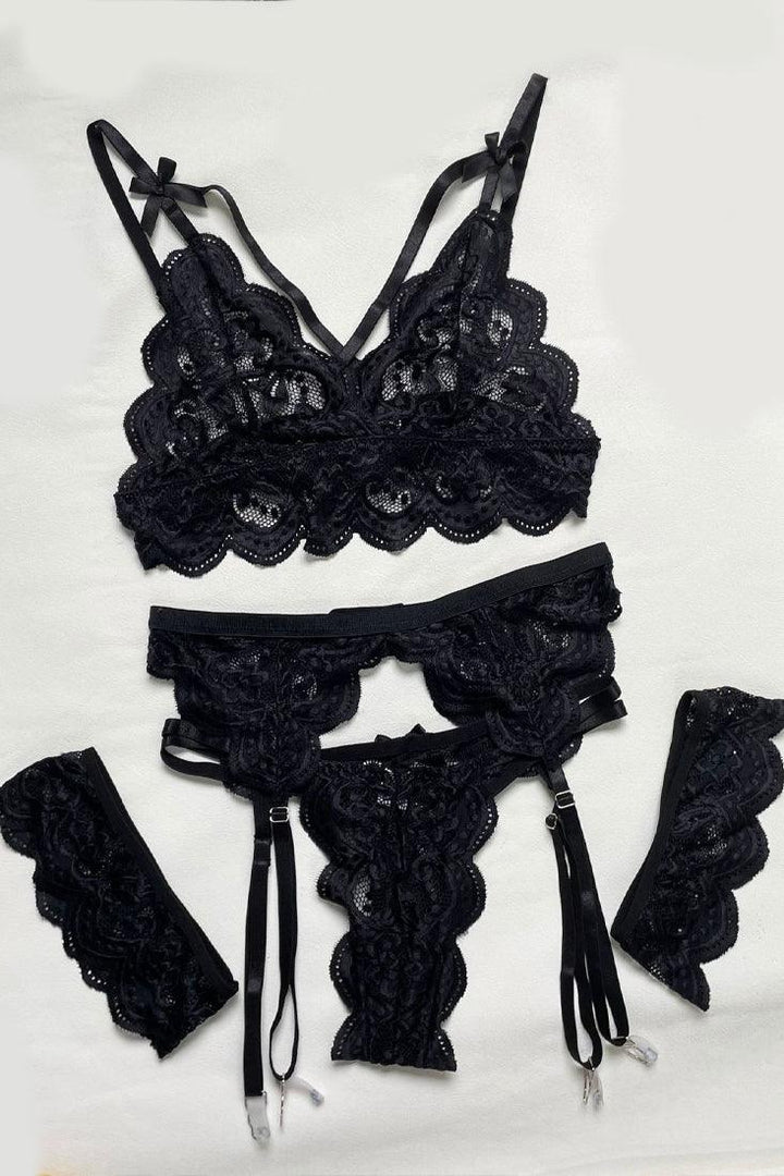 Black Lace Crochet Bra Thong Garter Belt 5Pc Sexy Lingerie Set T1593