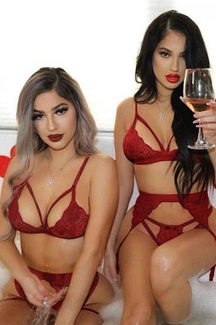 3pc. Lace lingerie set features adjustable strap bra with flower lace detail paired with matching garter belt and panty.