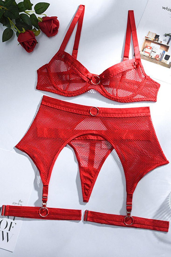Red Netted Mesh Bra Garter Pantie Lingerie Set