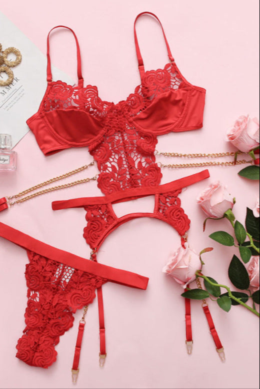 Turn up the heat with this Red Flower Crochet Chain Garter Thong 2-piece lingerie set. Featuring delicate crochet flowers and daring chain details, it’s designed to make you feel irresistibly sexy and confident. Perfect for playful nights in or special occasions, this set combines bold style with a flirty touch.