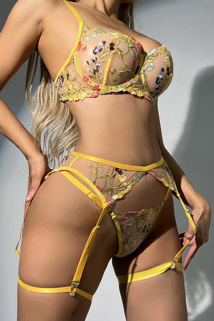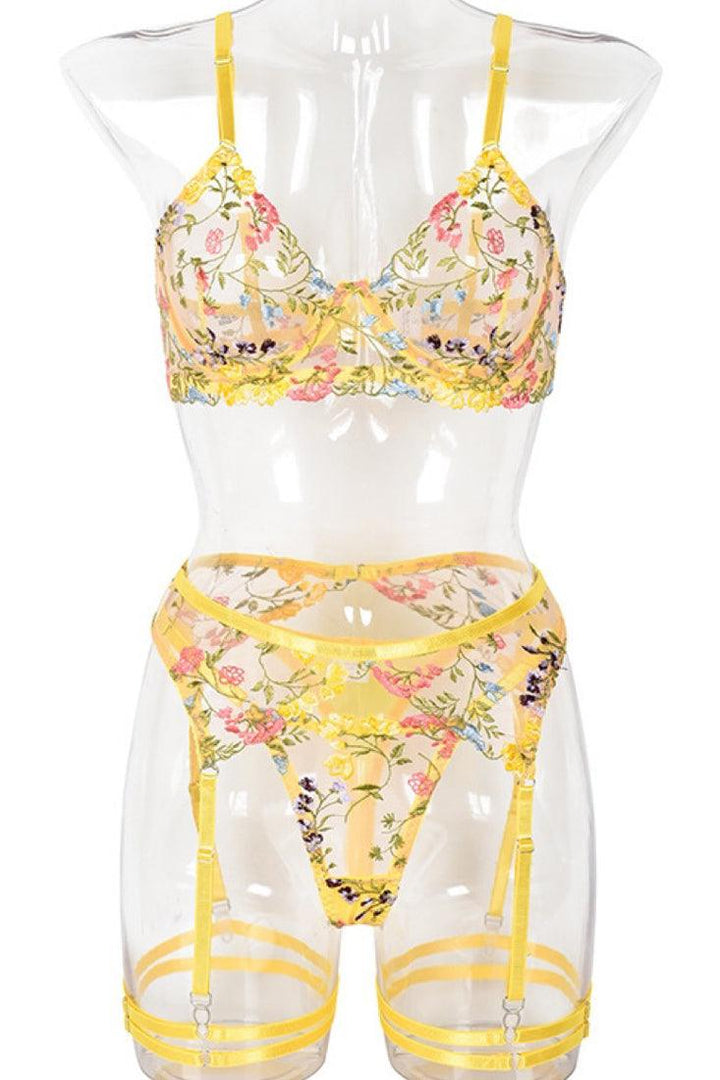 Yellow Floral Embroider Sheer Lace Bra Thong Garter 5Pc Lingerie Set