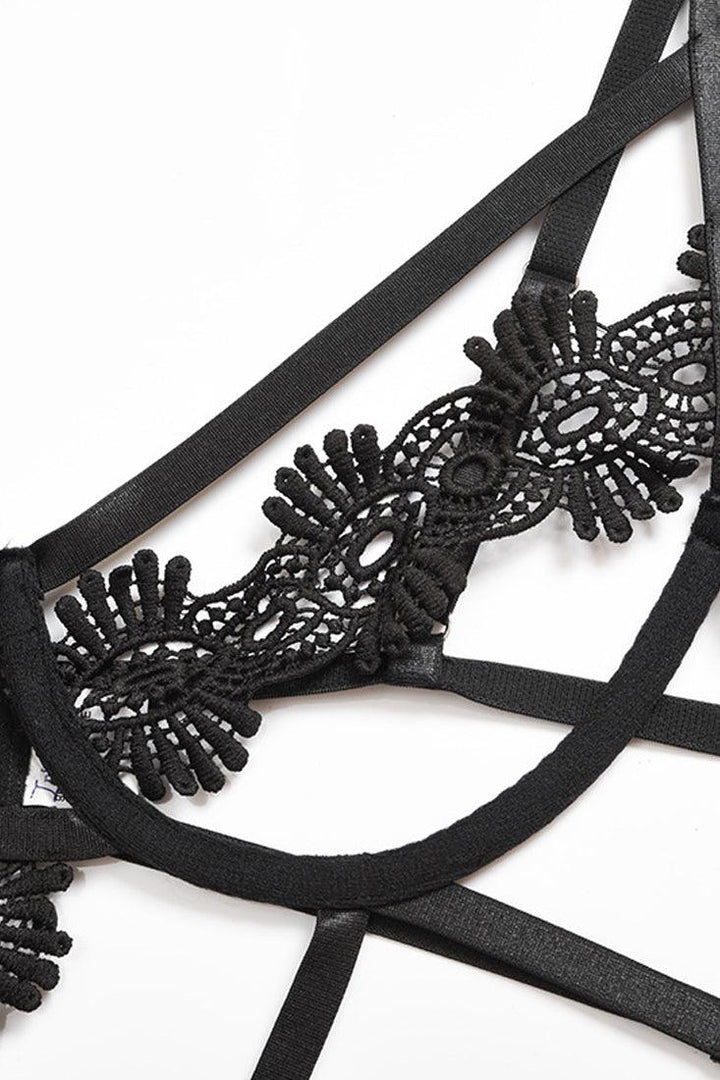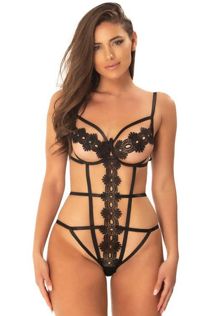 Sexy Black Crochet Strappy Bodysuit Lingerie