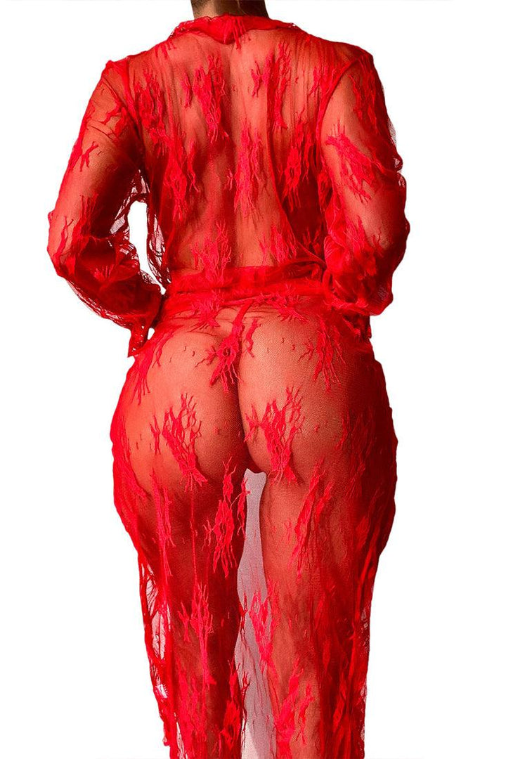 Red Sheer Lace Long Robe Kimono Thong 2Pc Lingerie Set