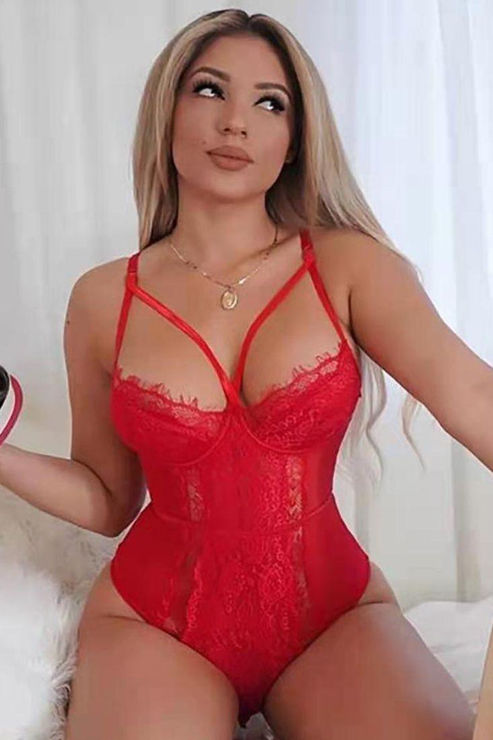 Red Sleeveless Caged Lace Mesh Sexy Teddy