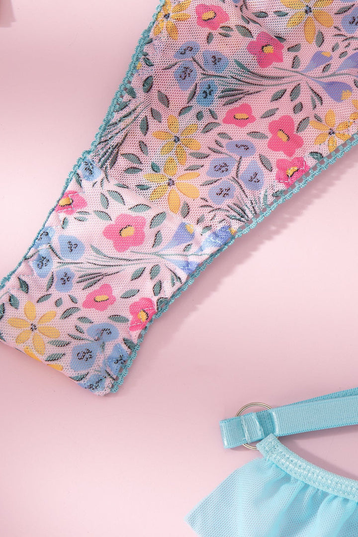 Light Blue Floral Print Mesh Ruffle Strappy Garter Thong 5Pc Sexy Lingerie Set
