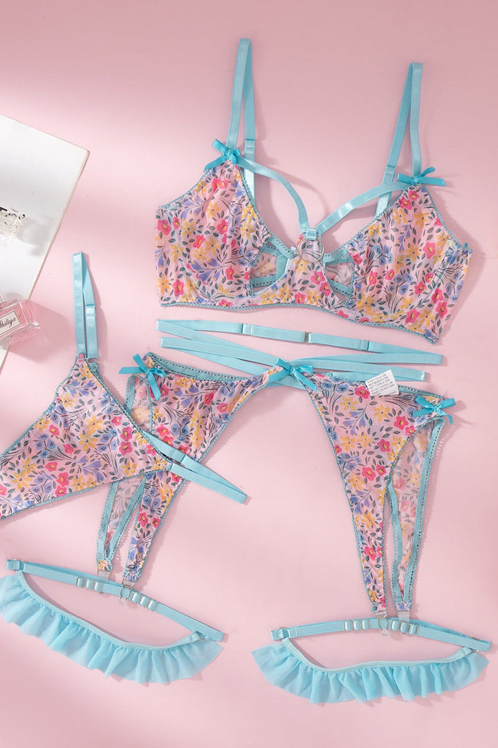 Light Blue Floral Print Mesh Ruffle Strappy Garter Thong 5Pc Sexy Lingerie Set
