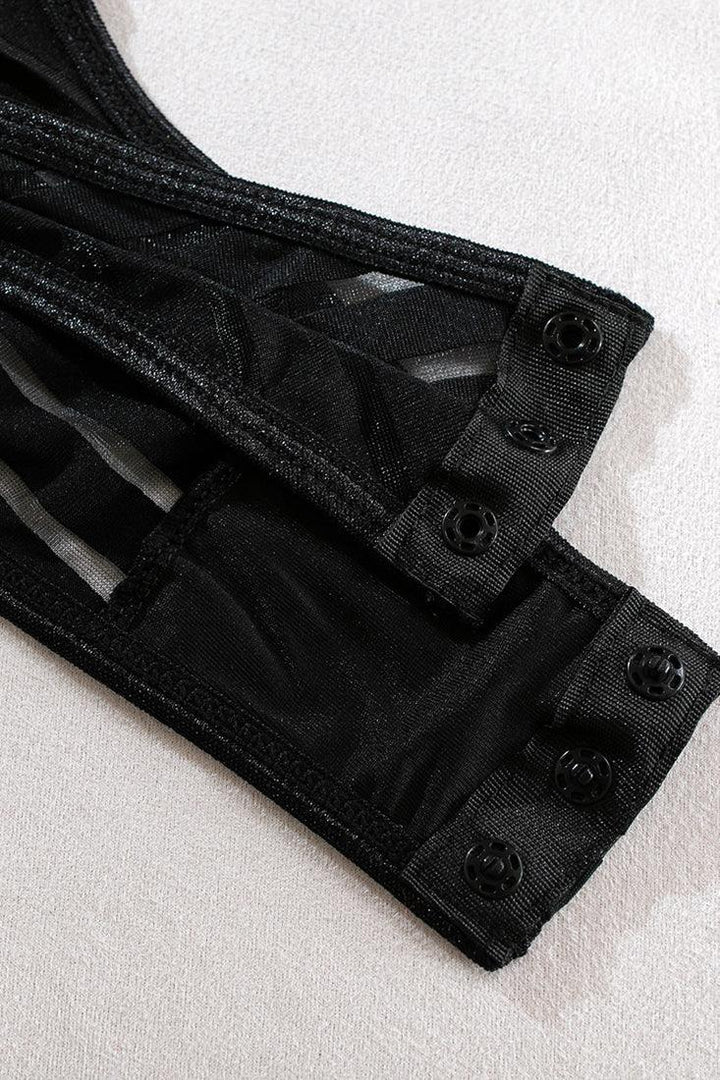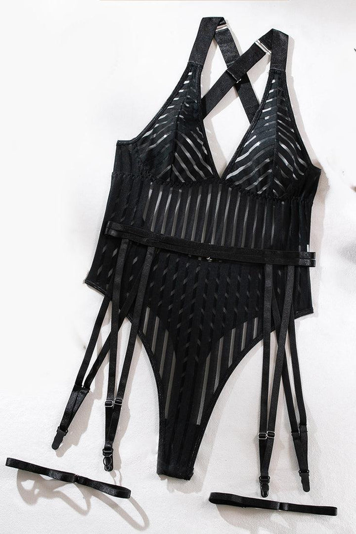 Black Stripes Mesh Bandage Garter Belt Bodysuit 4Pc Sexy Lingerie Set