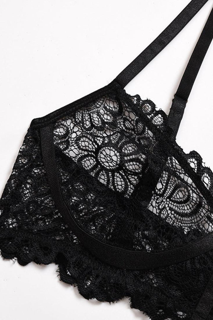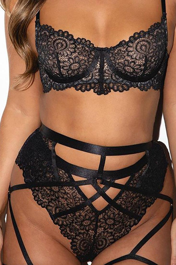 Black Lace Strappy Cut-Out Bra Underwear 2Pc Lingerie Set