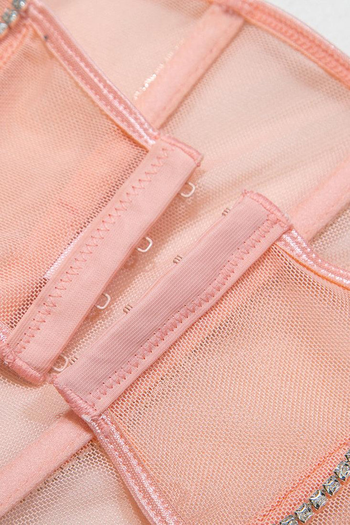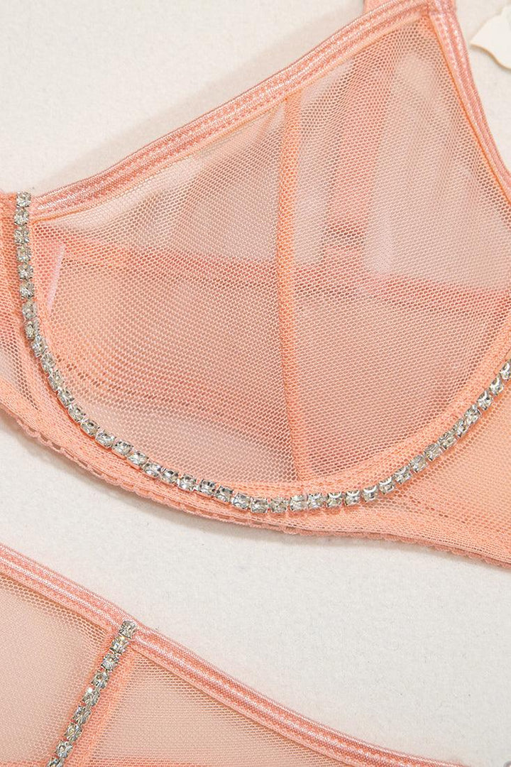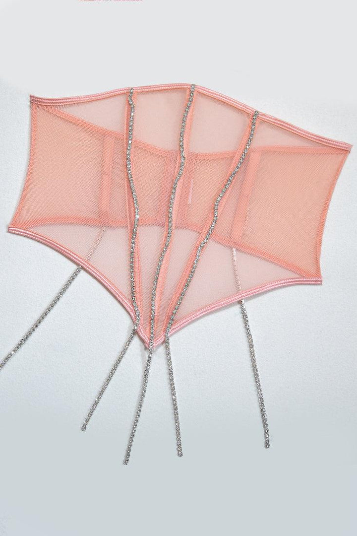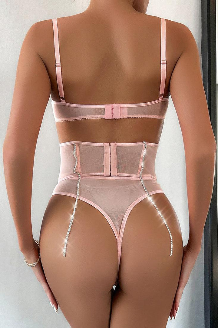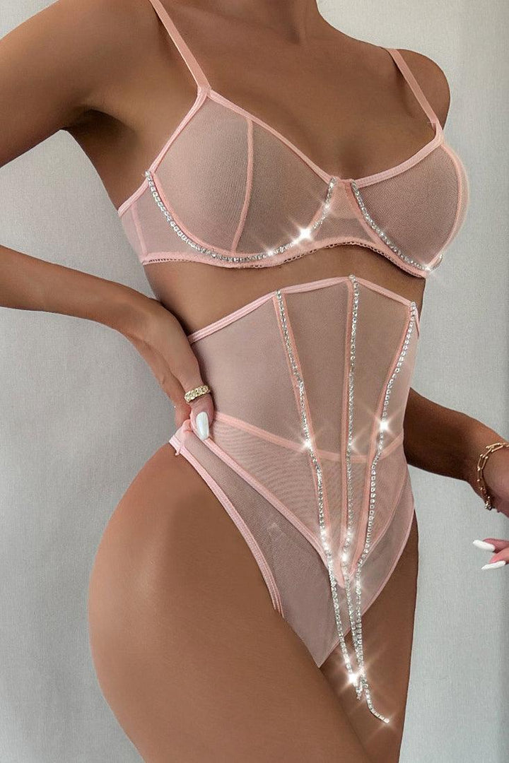 Pink Rhinestone Mesh Boned Corset Thong 3Pc Sexy Lingerie Set