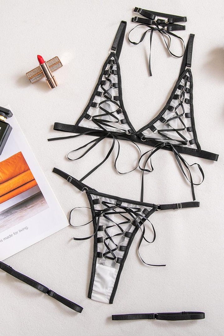 Black White Mesh Lace-Up Sexy Bra Thong Garters Choker 4Pc Lingerie Set