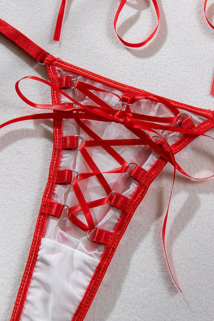 Red White Mesh Lace-Up Sexy Bra Thong Garters Choker 4Pc Lingerie Set