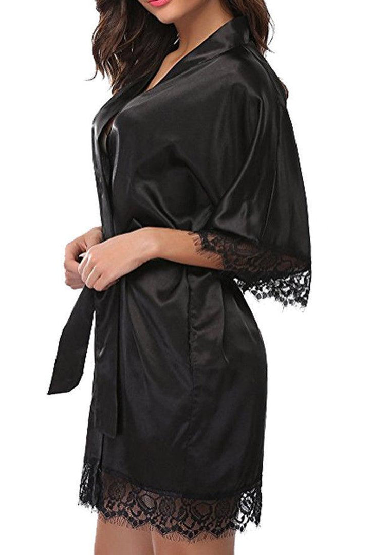 Black Satin Lace Kimono Robe With Belt Lingerie Set