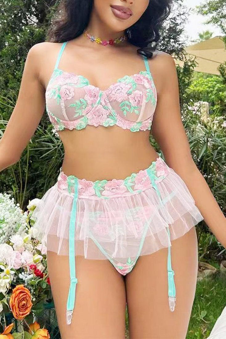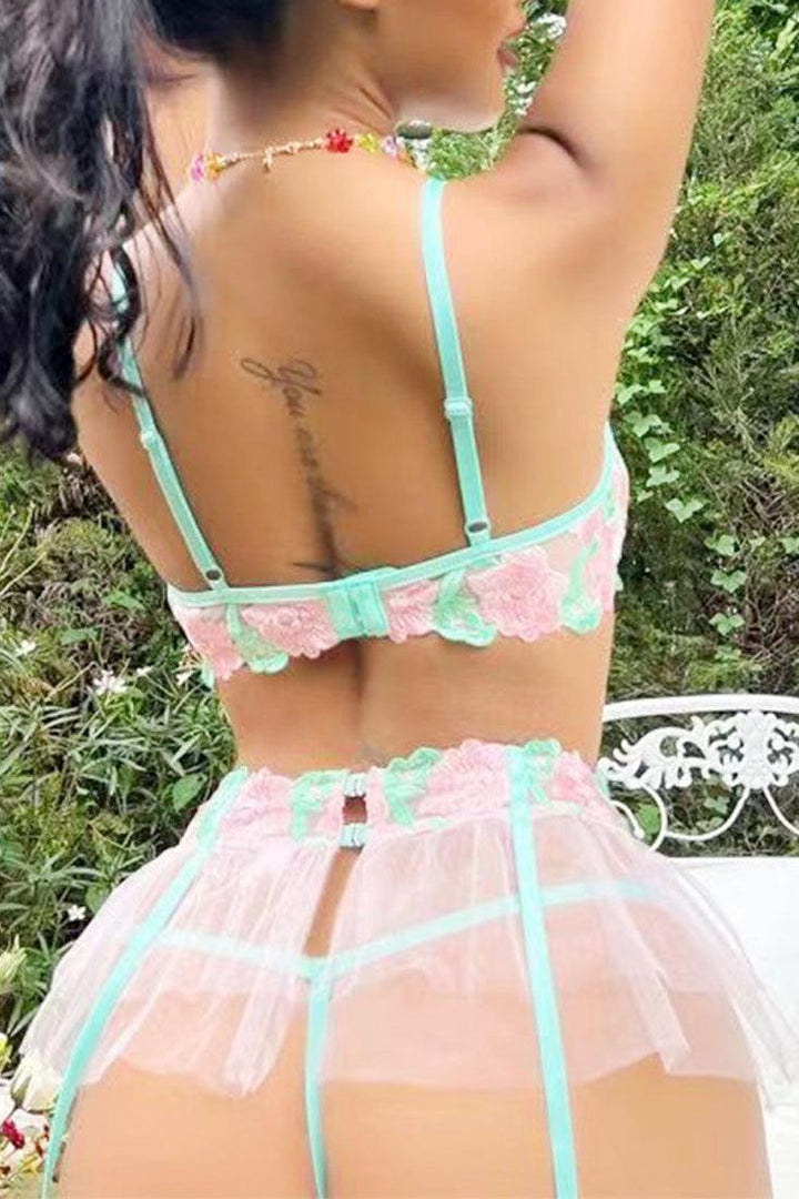 Mint Pink Tutu Mesh Floral Embroidered 3Pc Lingerie Garter Set