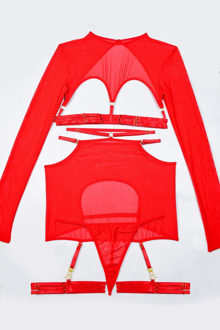 Red Strappy Bandage Long Sleeve Mesh Open Chest Garter Thong 5Pc Lingerie Set