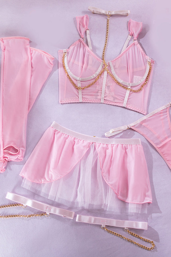 Pink Gold Chain Mesh Garters Thong Gloves Sexy 7Pc Lingerie Set