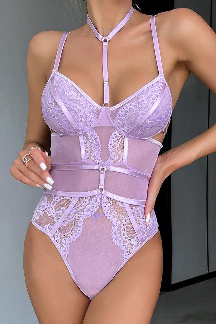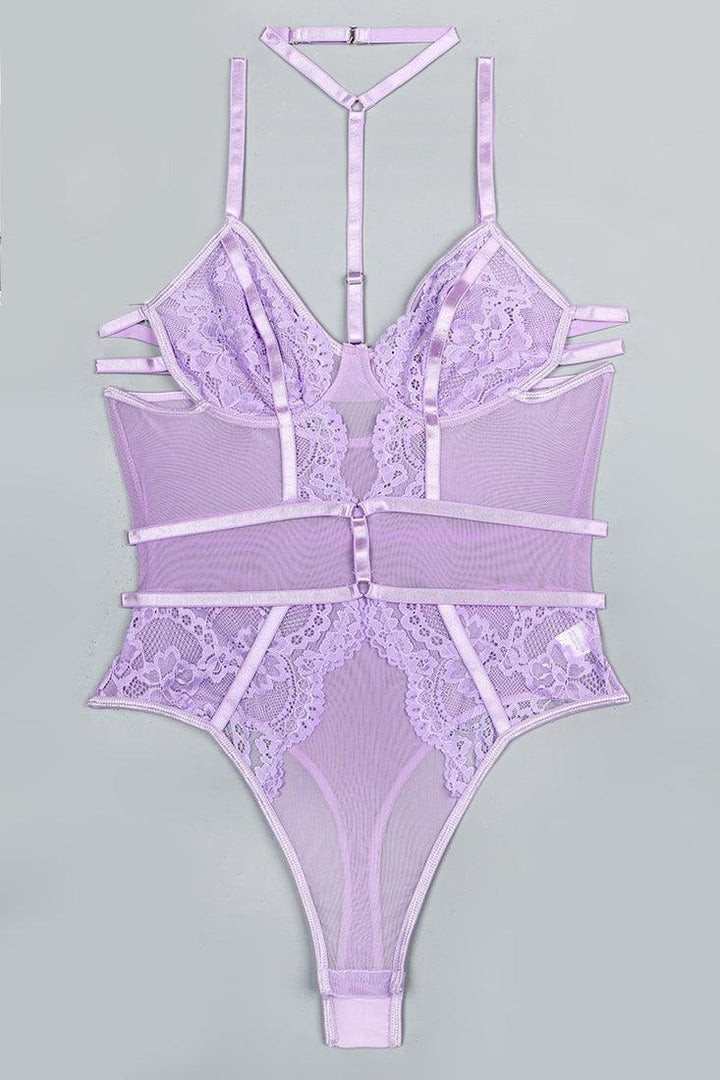 Lavender Lace Mesh Choker Strappy Thong Lingerie Sexy Bodysuit