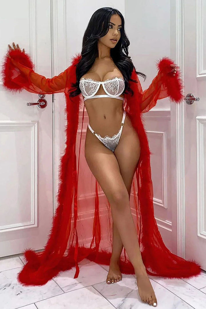 Red Long Sleeve Mesh Faux Fur Trim Long Maxi Robe Lingerie
