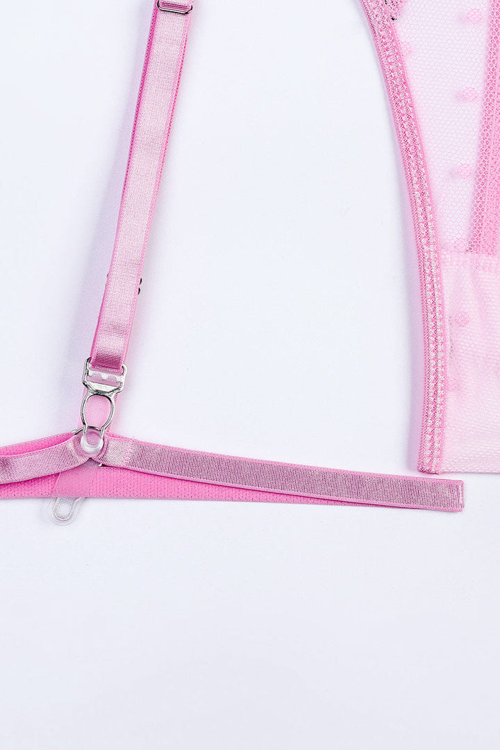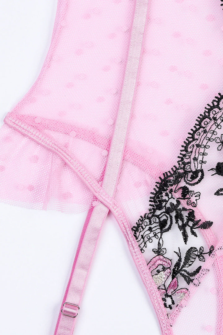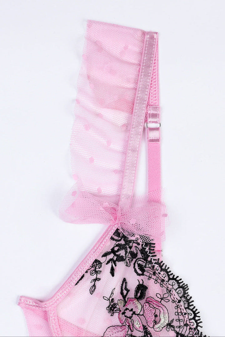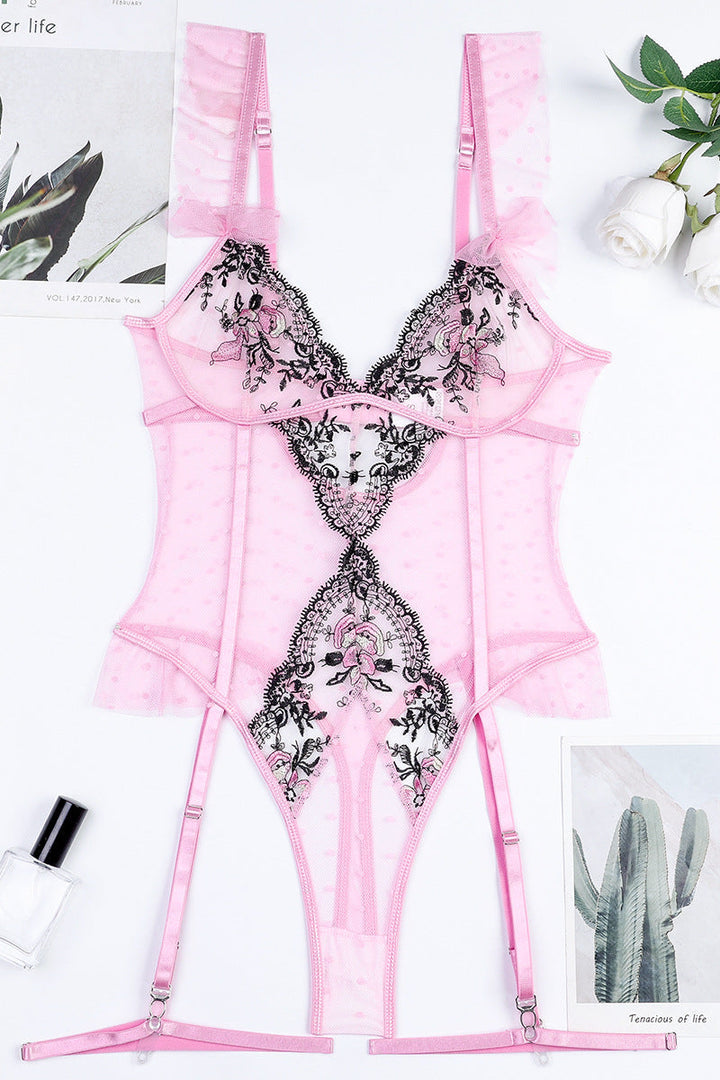 Light Pink Mesh Embroidered Lace Ruffle Garter Thong Sexy 3Pc Bodysuit Lingerie