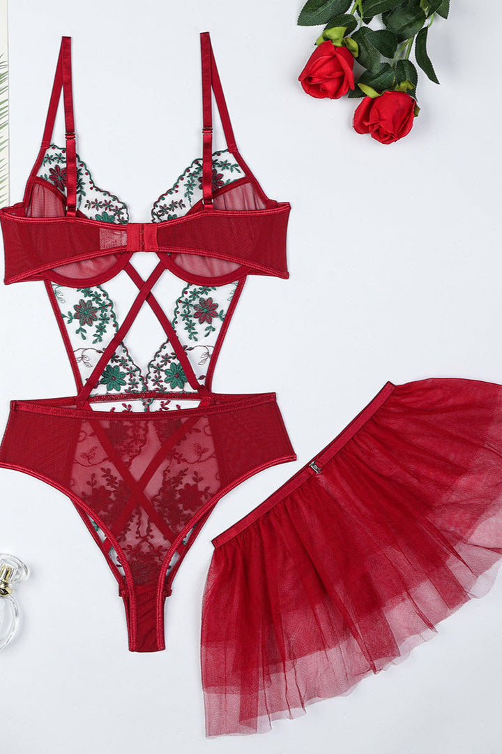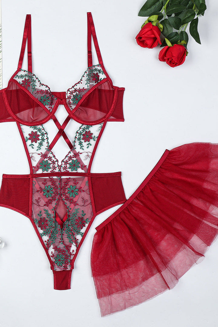 Wine Floral Lace Mesh Bodysuit Mesh Tutu Skirt 2Pc Sexy Lingerie Set