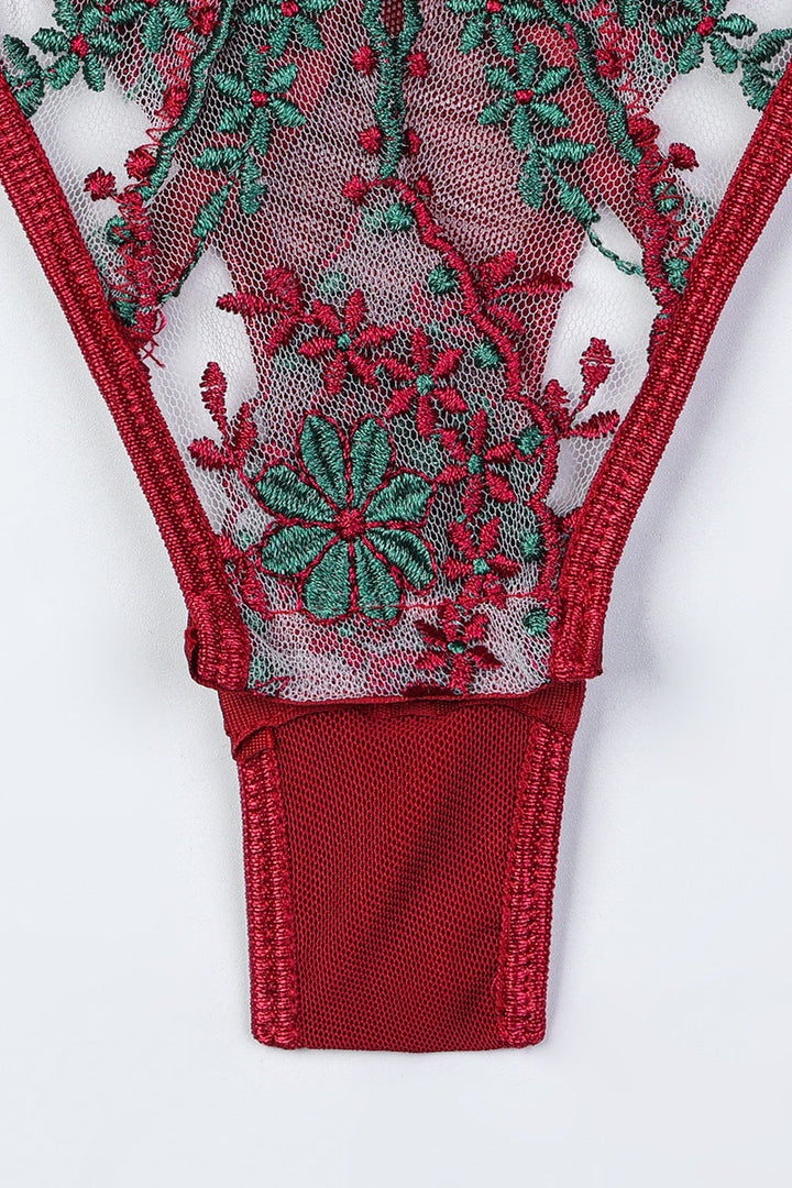 Wine Floral Lace Mesh Bodysuit Mesh Tutu Skirt 2Pc Sexy Lingerie Set
