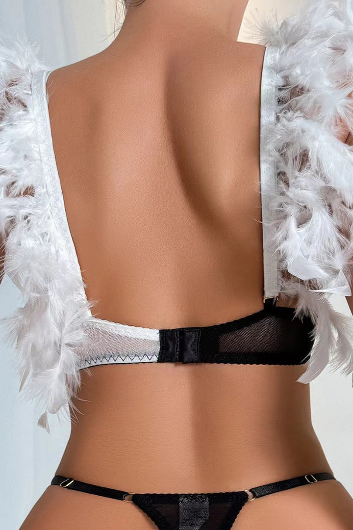 Black White Chain Feather Sexy 2Pc Lingerie Set