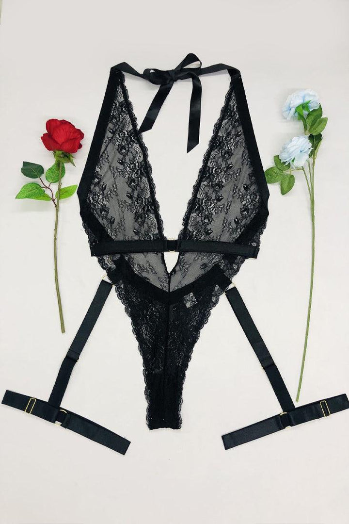 Black Plunging V-Neck Halter O-ring Garter Belt Sexy Lingerie