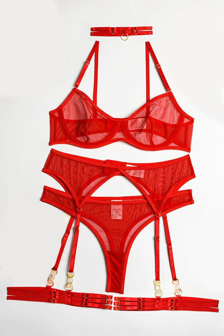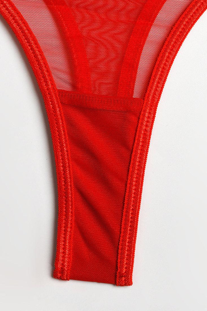 Red Mesh Sheer Bandage Garter Thong 5Pc Sexy Lingerie Set