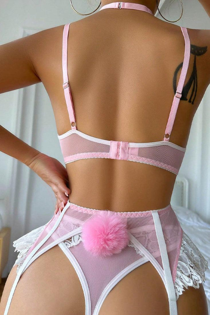 Add some fun and flirtation to your lingerie collection with our Pink White Mesh Lace Set. This 5-piece set includes a bra, garter, thong, and choker all adorned with mesh and lace details. Perfect for a playful night in.