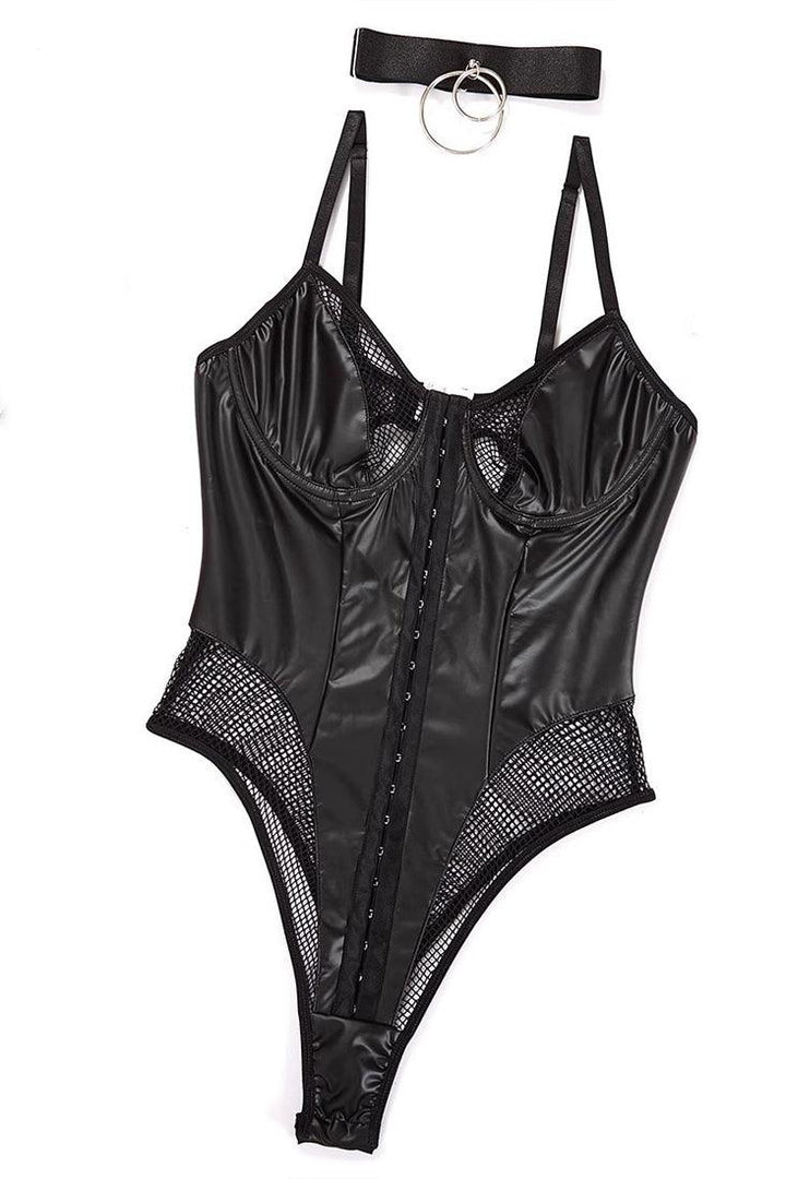 Black Faux Fur Hooks Netted Choker Thong Sexy Lingerie Bodysuit
