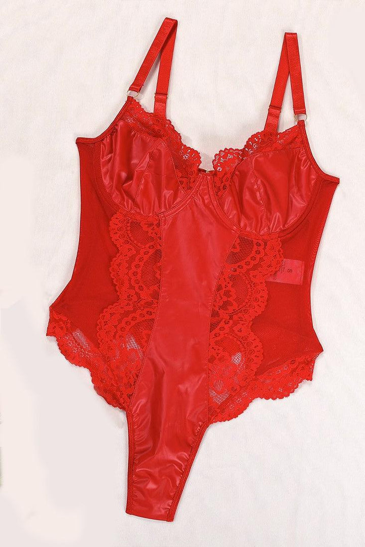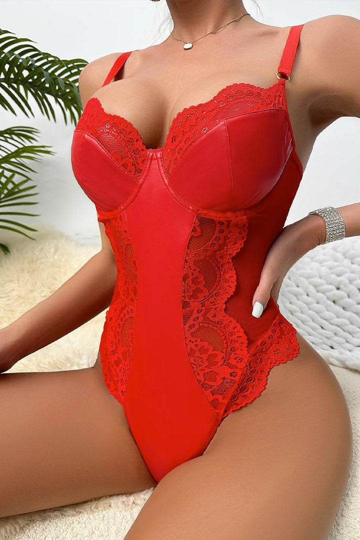 Red Faux Leather Lace Sides Sexy Thong Lingerie Bodysuit