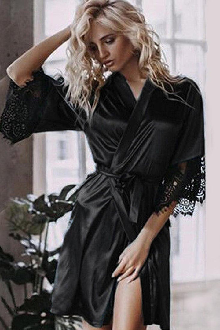 Black Satin Eyelash Lace Belted Sexy Robe Lingerie