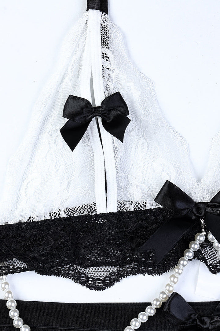 Black White Mesh Lace Pearl Bow Thong Skirt Apron Sexy 3Pc Lingerie Set