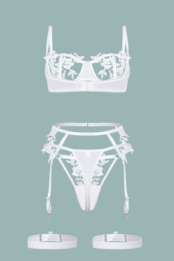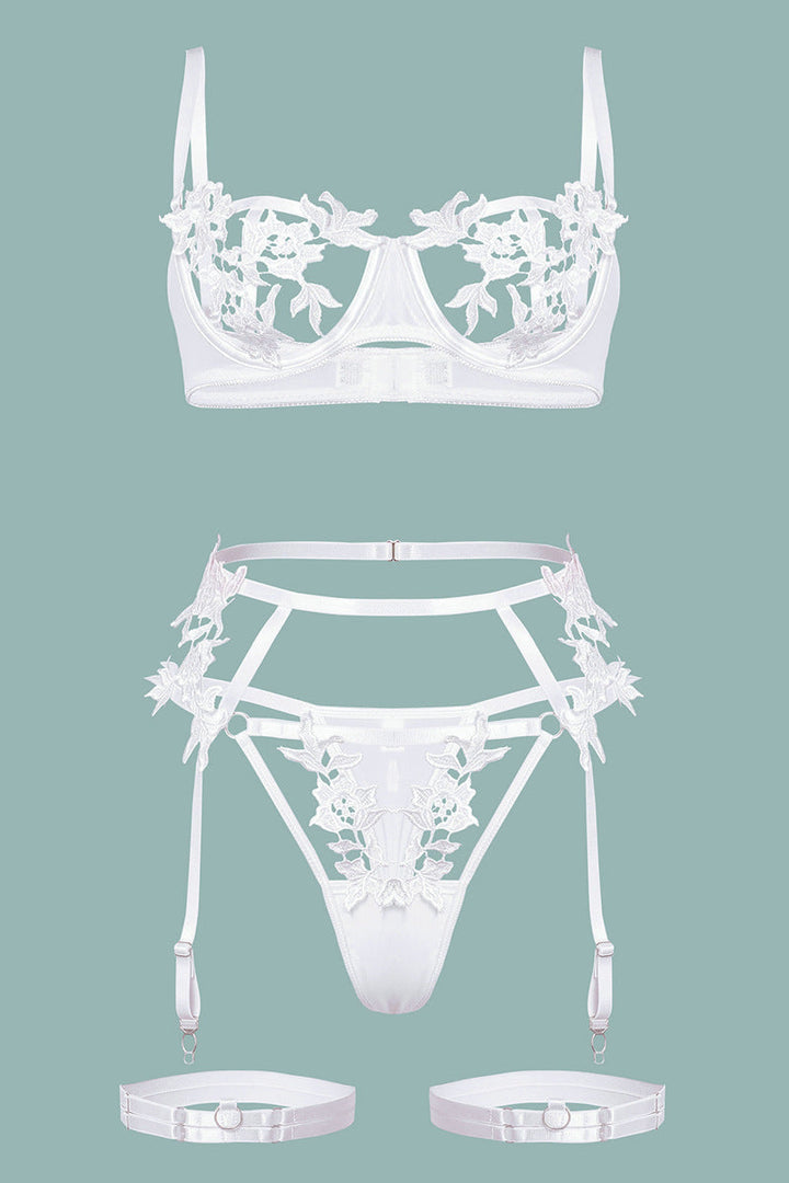 White Crochet Cut-Out Wired Garter Belt Thong Sexy 5Pc Lingerie Set