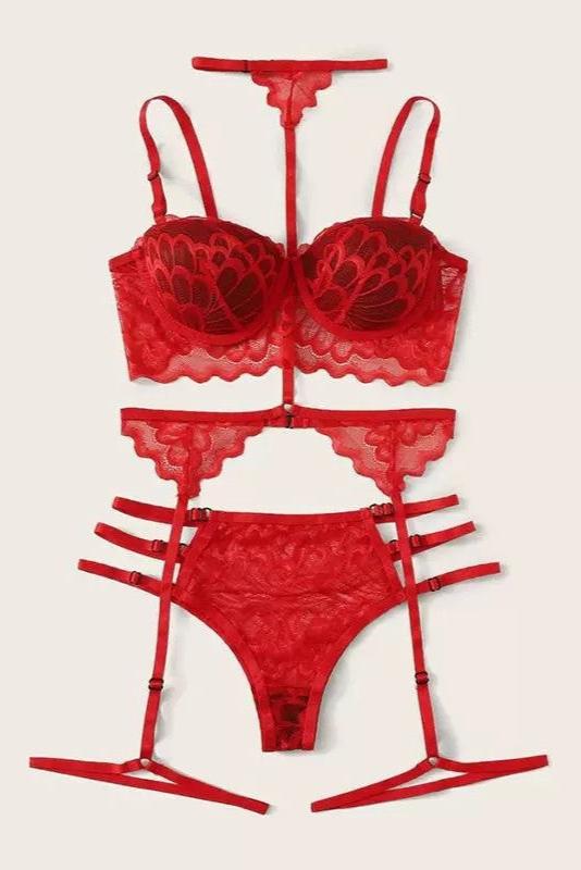 This choker-style garter belt will definitely turn up the heat in the bedroom! Featuring; 3 pc, bralette, matching panties, garter belt with choker, floral lace, adjustable straps, no underwire or padding, followed by a sexy wear. Stretch fit. 80% Nylon 20% Spandex