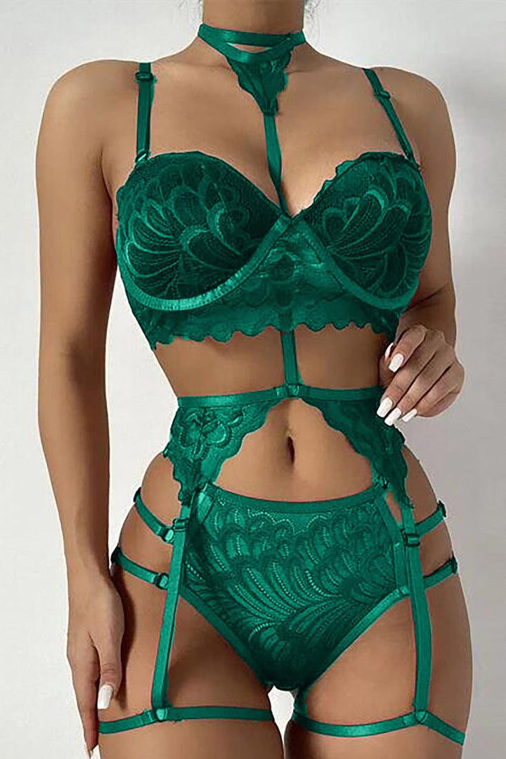 Sexy Choker Green Floral Lace Garter Belt Panty 3 Pc Set GT245