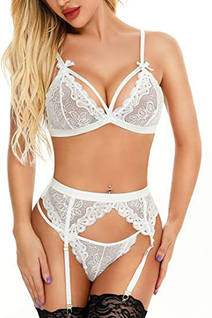 White Strappy Lace Bra Garter Pantie Lingerie Set