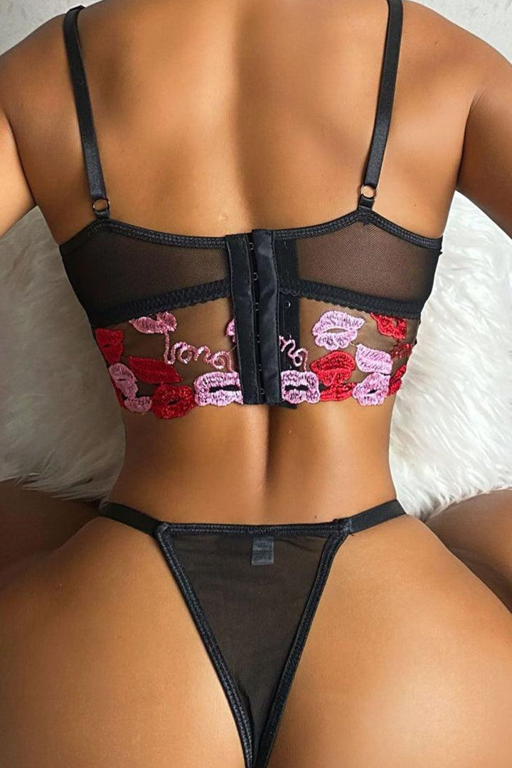 Black Red Lips Love Embroider Mesh Bra Thong 2Pc Sexy Lingerie