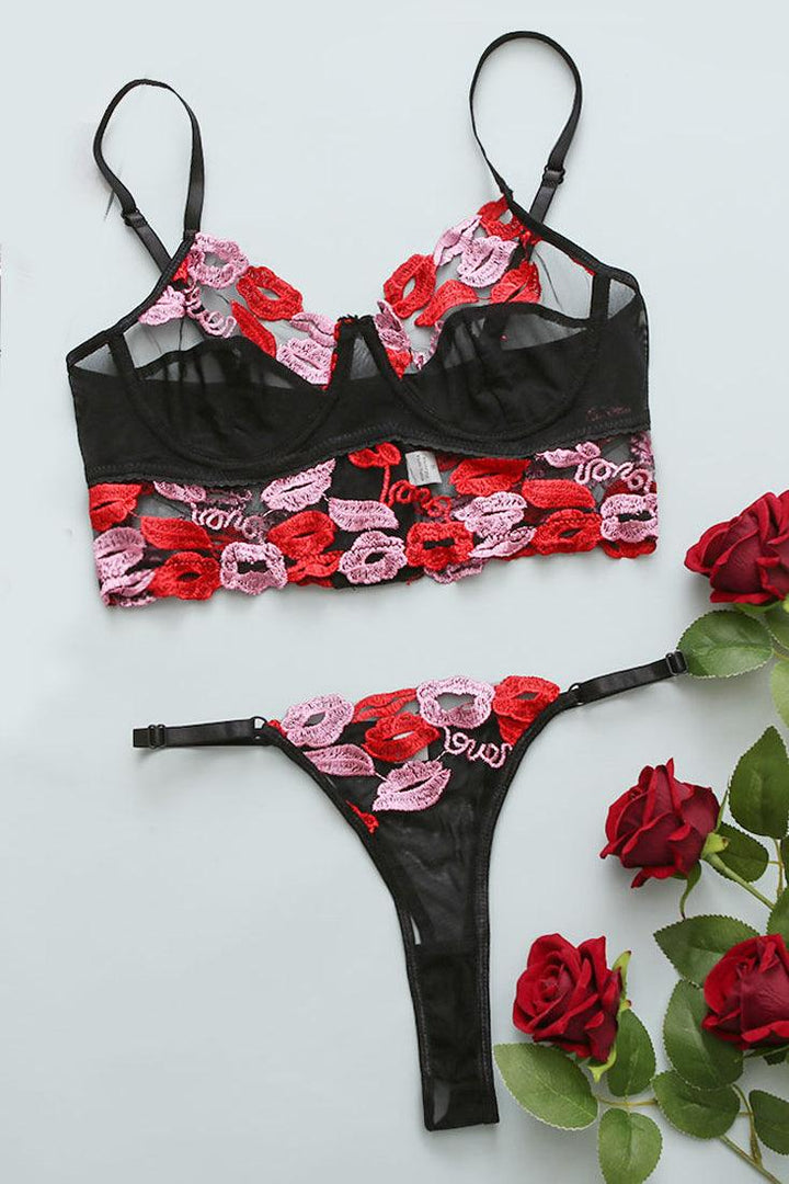 Black Red Lips Love Embroider Mesh Bra Thong 2Pc Sexy Lingerie