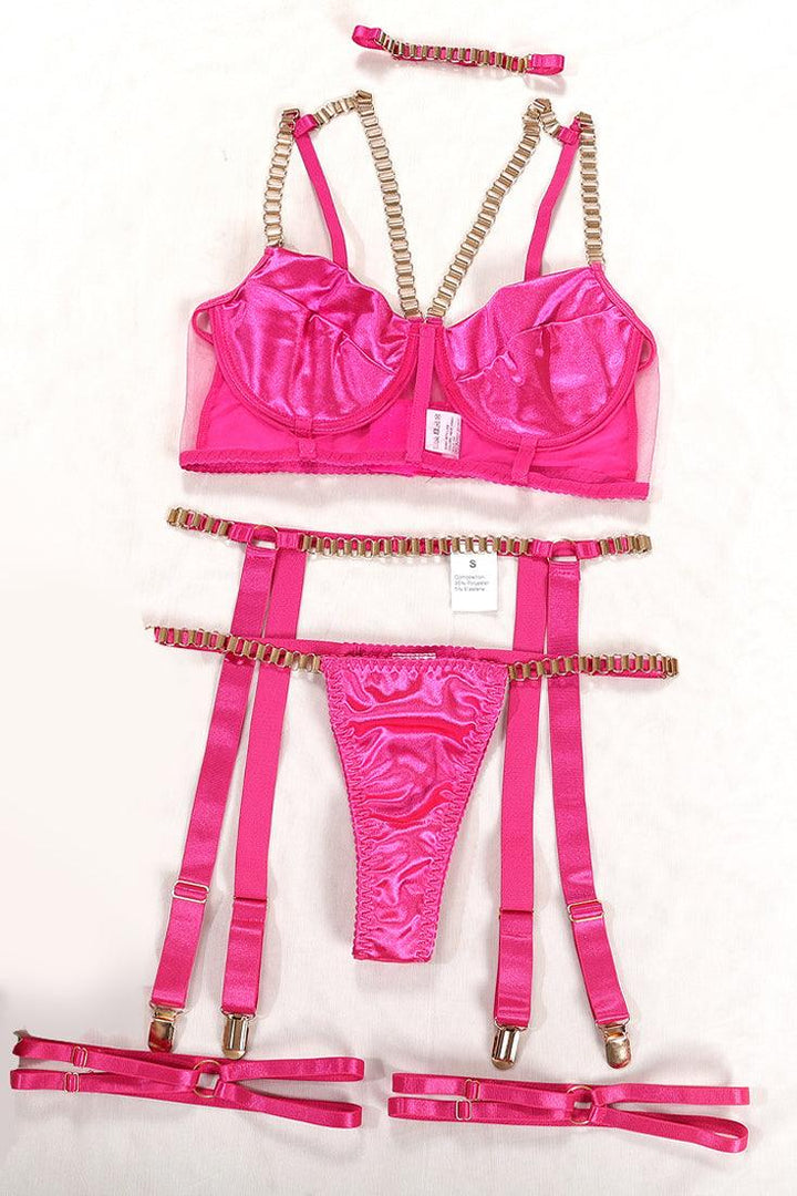Hot Pink Satin Mesh Chain 6 Pc Thong Garter Lingerie Set