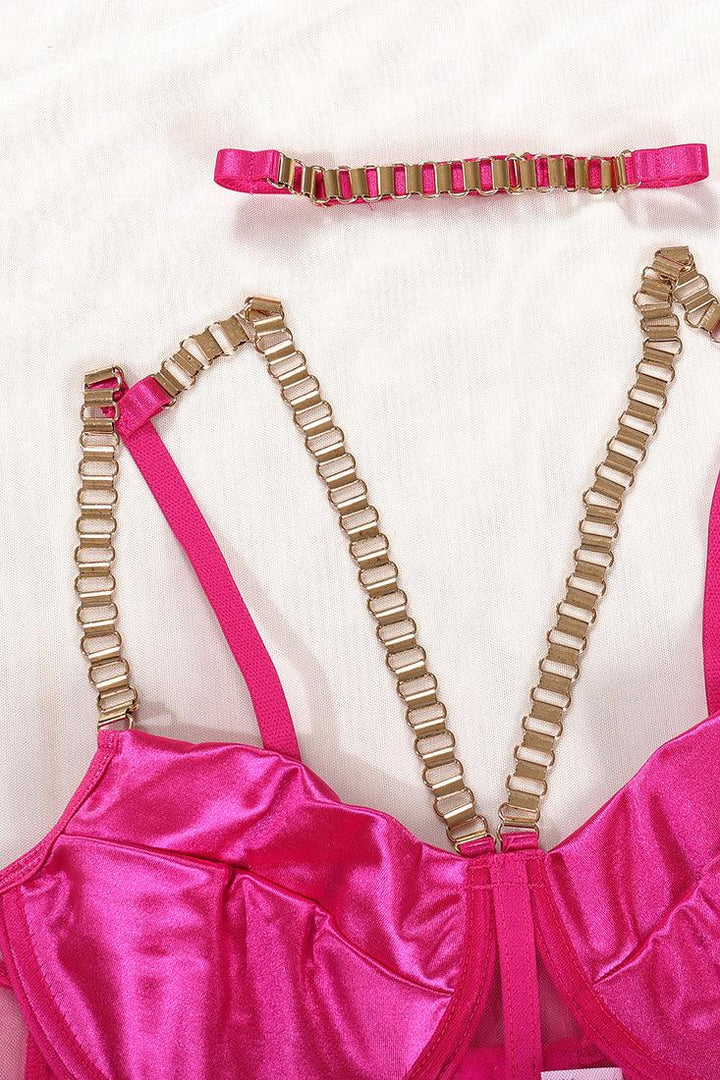 Hot Pink Satin Mesh Chain 6 Pc Thong Garter Lingerie Set