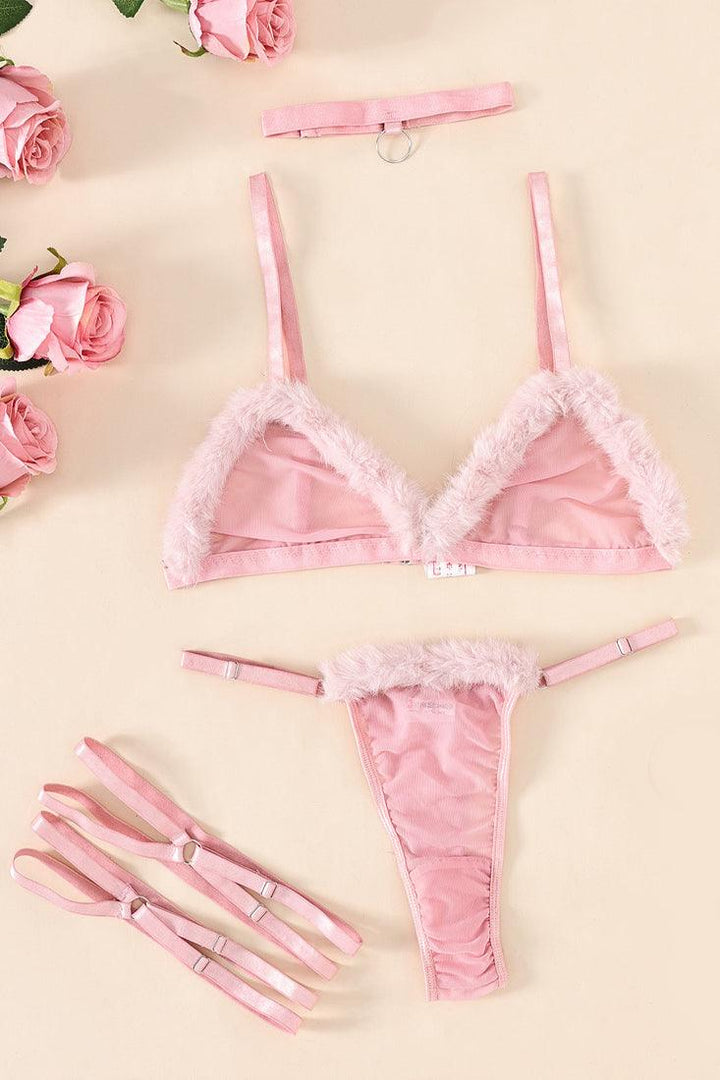 Pink Fur Mesh Choker Bra Thong Garters 5Pc Sexy Lingerie Set