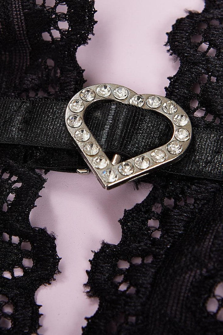 Black Lace Rhinestone Hearts Strappy Garter Top Underwear 2Pc Lingerie Set