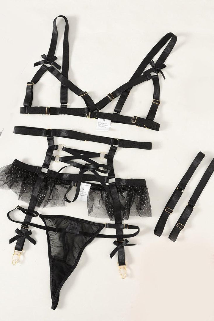 Black Bare Chest Strappy Tutu Lace-Up Thong Garter Sexy 5Pc Lingerie Set