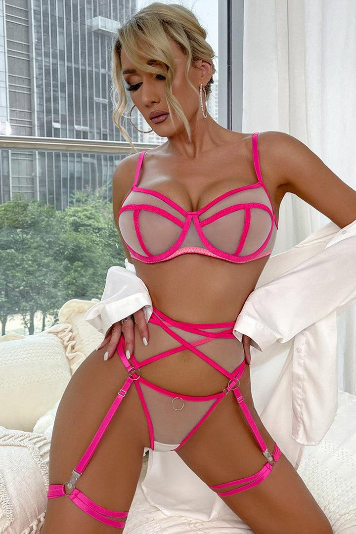 Indulge in this daring Hot Pink Beige Mesh Strappy Bra Thong Garter Belt 5Pc Lingerie Set and discover the perfect combination of sexy and playful. Featuring a hot pink and beige mesh design, this set includes a strappy bra, thong, and garter belt for a complete and seductive look. (Flirtatious and charming, this set adds an extra dose of fun to your lingerie collection.)
