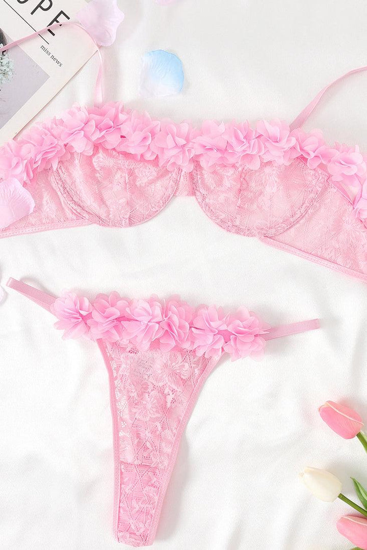 Light Pink Floral Lace 3D Flower Bra Thong 2 Pc Lingerie Set