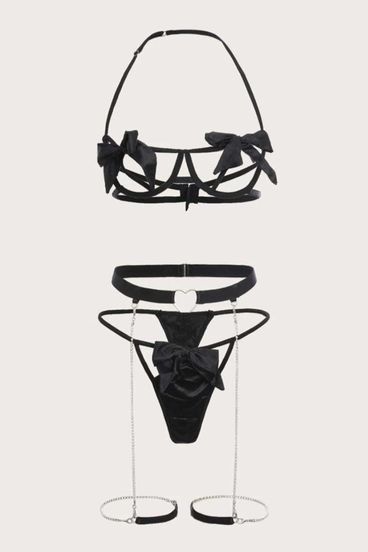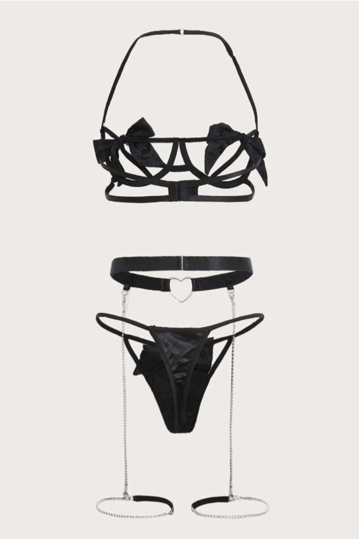 Sexy Black Bow Rhinestone Heart Garter 3 Pc Lingerie Set